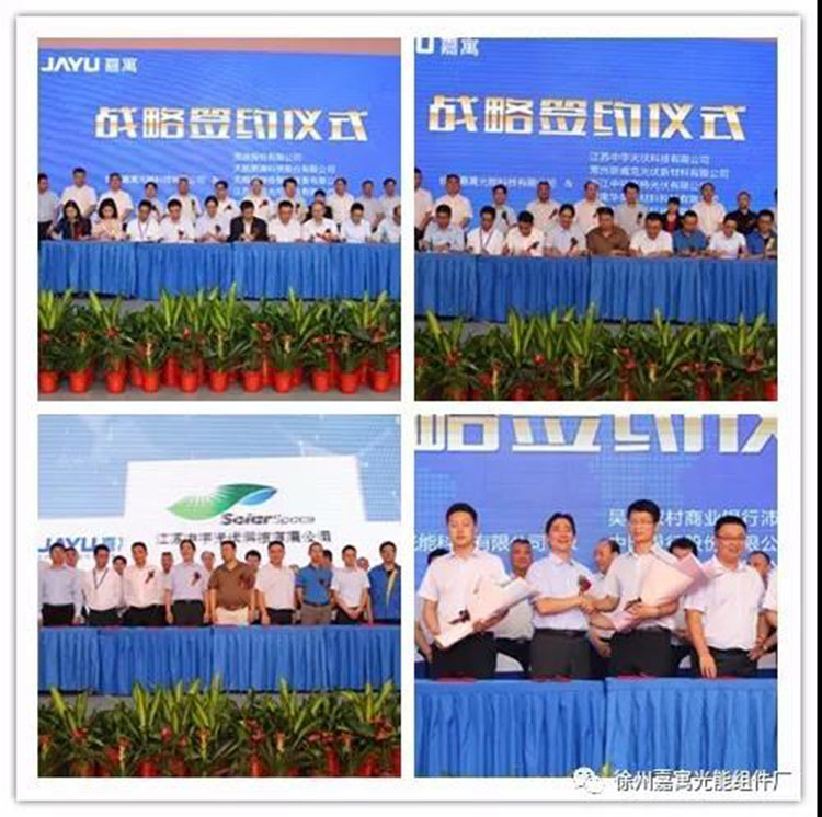 與茂迪股份有限公司、太極能源科技股份有限公司、無錫奧特維智能裝備有限公司、TUV北德集團(tuán)、江蘇順風(fēng)光電科技有限公司、華美新材料科技有限公司、江蘇中宇光伏科技有限公司、常州斯維克光伏新材料有限公司、浙江中環(huán)賽特光伏有限公司 、江蘇鼎飛鋁業(yè)科技有限公司、江蘇銀行股份有限公司沛縣支行、吳江農(nóng)村商業(yè)銀行沛縣支行、中國銀行股份股份有限公司沛縣支行十三家企業(yè)簽署了戰(zhàn)略合作協(xié)議。